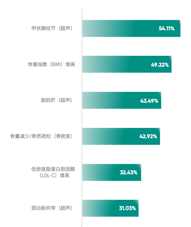 高净值人群(企业家、高管)也同样面临“高风险”。《中国企业家健康绿皮书(2024版)》数据显示,54.11%的企业家存在甲状腺结节问题,而体重指数(BMI)、脂肪肝、骨质疏松等健康问题检出率均超过30%。这不仅意味着健康风险提前,也说明高压、高负荷的工作模式正在透支新时代职场人。